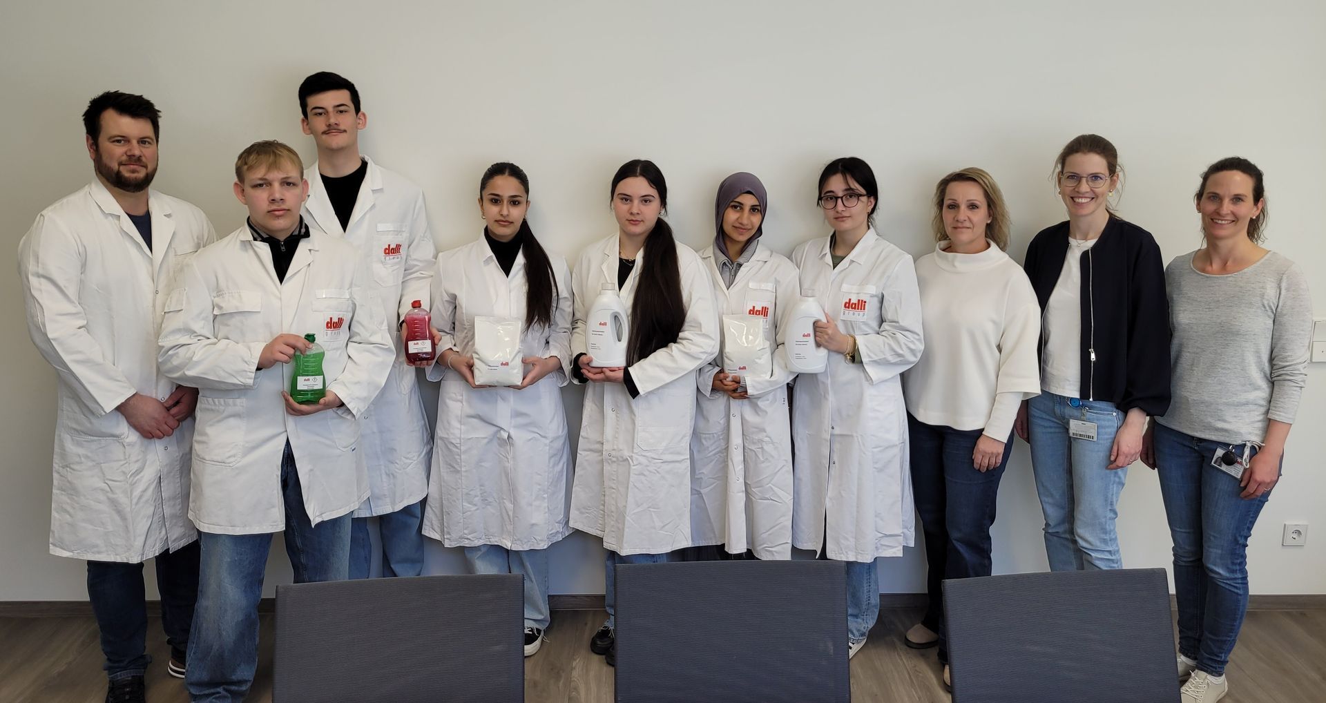Zara (EF) und Tamara (Q1) widmeten sich der Herstellung eines klassischen Vollwaschmittelpulvers. Die verschiedenen Wirkstoffe wurden gemäß einer betriebseigenen Rezeptur zusammengestellt und eingewogen. Hierbei waren Präzision und ein sachgemäßer Umgang mit den z. T. anspruchsvollen Chemikalien gefragt. Zum Schluss wurde das Produkt ebenfalls mit einem individuell gewählten Duft veredelt und professionell abgepackt. Etwas aufwändiger war das Anmischen eines Flüssigwaschmittels, für das sich Mariam und Erva (beide Q1) entschieden hatten. Genau wie Mitschüler Max hatte Erva schon im Vorjahr bei einem Projekttag bei Dalli mitgewirkt und beide hatten diese Möglichkeit unbedingt ein zweites Mal nutzen wollen. Erva hatte Dalli bei einem Girls‘-Day-Tag erstmals kennengelernt, den sie in der 8. Klasse im Zuge der KURS-Lernpartnerschaft beim Kooperationspartner ihrer Schule verbracht hatte. Spätestens nach einem Praktikum beim Schwesterunternehmen Grünenthal sei ihre Begeisterung und Neugier für die Chemie endgültig entfacht worden: „Ich wollte unbedingt wieder einen zweiten Projekttag bei Dalli verbringen, denn das praktische Arbeiten im Labor macht mir einfach Spaß!“ Ihre Mitschülern Mariam ergänzte: „Wir wurden hier super betreut und ich bin sehr dankbar, dass wir heute Einblicke in verschiedene Bereiche und Chemie-Berufe bekommen konnten.“