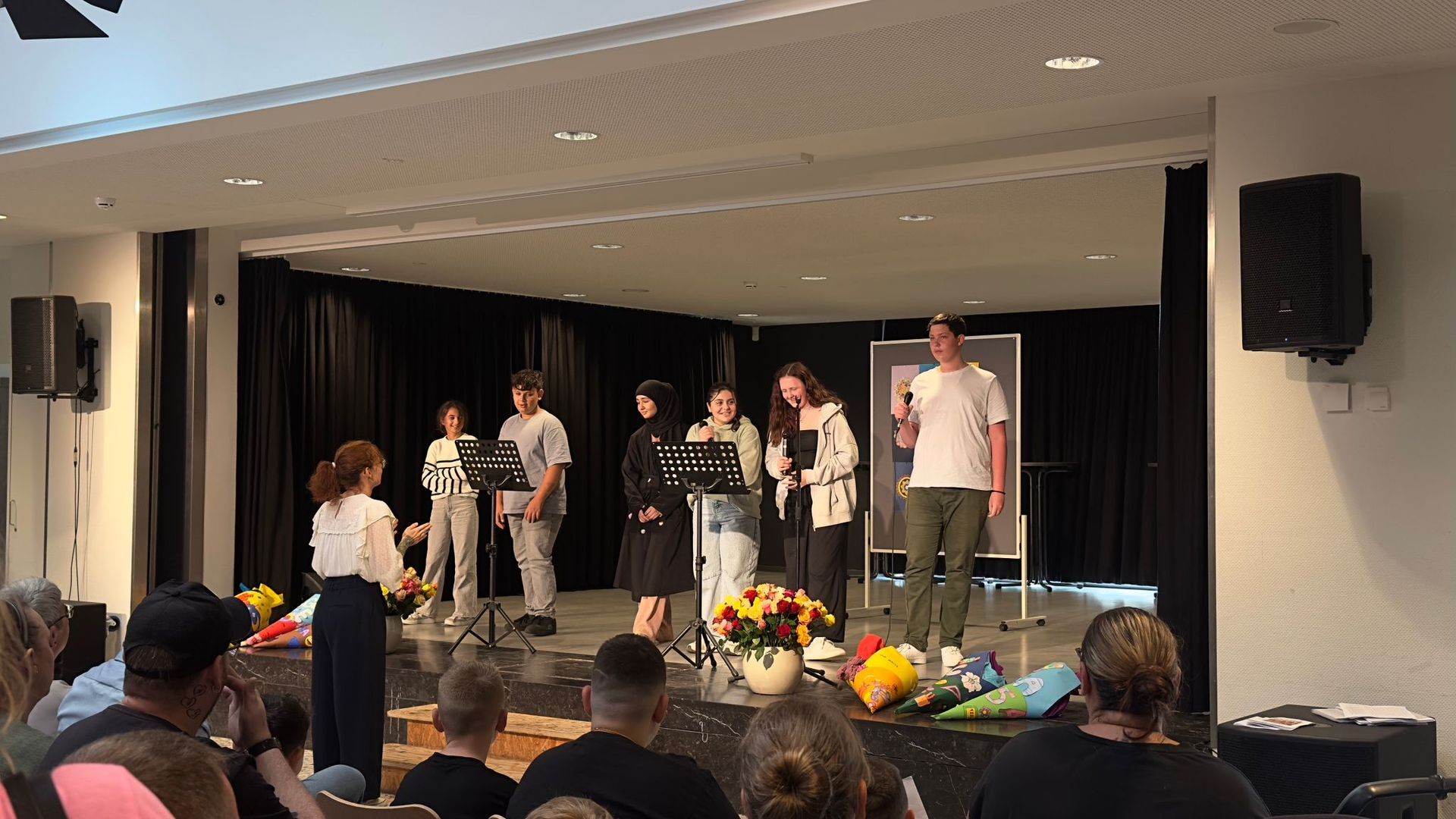Am 04.07.2025 trafen sich in der stilvoll geschmückten Aula die toll herausgeputzten Schülerinnen und Schüler der KuGesa samt Begleitung. Herr Klein und natürlich alle Begleiterinnen und Begleiter, sowohl aus dem privaten als auch dem schulischen Kontext, sind enorm stolz auf das, was dieser Jahrgang – unser erster, der in Mausbauch auch eingeschult worden ist - geschafft hat! Was ist aus euch geworden! Tolle junge Menschen mit vielfältigen Begabungen! Diese für sich selbst und auch für die Gesellschaft zu nutzen, dazu ermunterte der Ehrengast Bürgermeister Patrick Haas. In ihrem Video krönten die Schülerinnen und Schüler die Lehrerinnen und Lehrer: die Liebste, der Coolste und der Kollege mit der fragwürdigsten Tafelschrift. Natürlich blieb Selbiges auf Seiten der Klassenleitung nicht verborgen. Diese offenbarten, wer am häufigsten zu spät kam und am meisten nervte und dennoch endete das Video der Klassenleitungen mit guten Wünschen für alle.